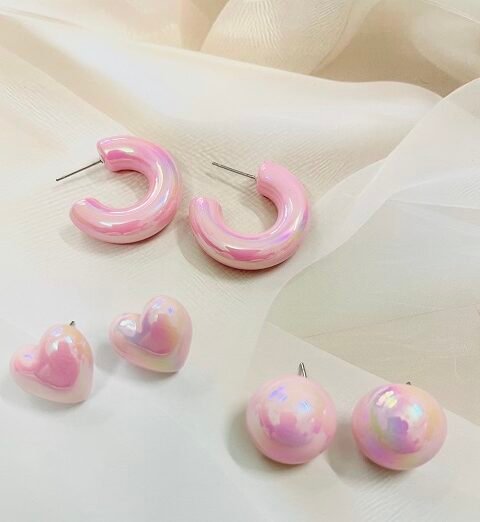 Iridescent Pink Earrings Set – Heart,Round & Chunky Hoop Designs | Kawaii Aesthetic Jewelry for Women & Girls