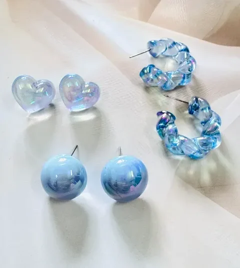 Iridescent Blue Heart studs,Twist Hoops & Button studs Earrings Combo – Elegant Glossy Statement Set by Razzle Dazzle