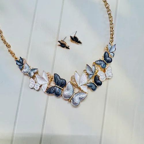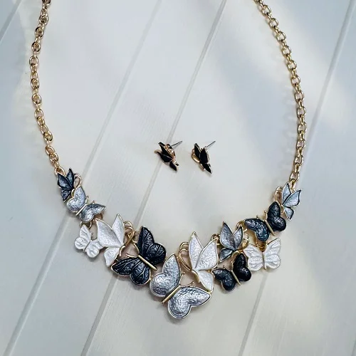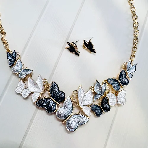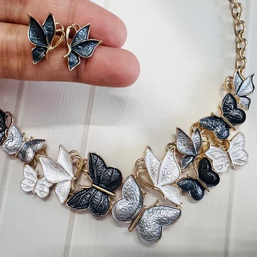 Embrace timeless elegance with our Dual-Tone Butterfly Necklace Set, beautifully designed to add a touch of charm and sophistication to any outfit. This gold-plated necklace features intricately crafted butterflies in stunning silver and black enamel finishes, symbolizing grace and transformation. Paired with matching butterfly stud earrings, this set is perfect for both casual outings and festive occasions.