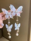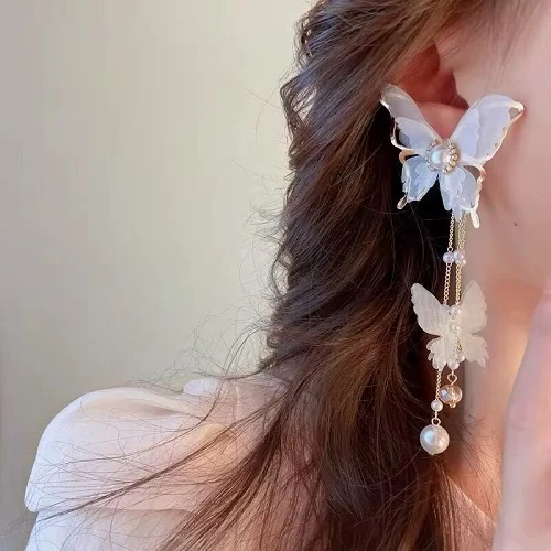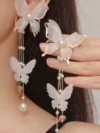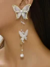 butterfly dangle earrings, pearl chain earrings, gold statement earrings, long drop earrings for women, bridal butterfly earrings, elegant fashion jewelry, luxury earrings for weddings.