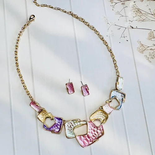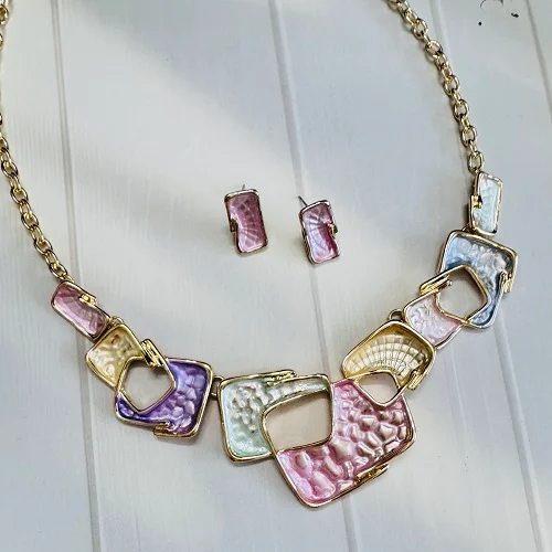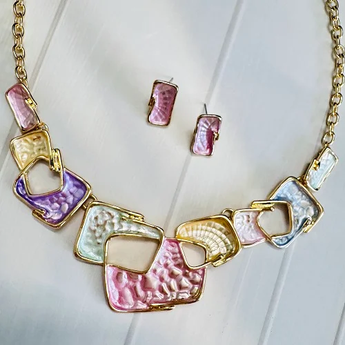 Add a touch of artistic elegance to your look with this pastel geometric necklace and earring set. Featuring interlocking square and rectangular shapes in soft hues of lavender, blush pink, mint, pearl white, and gold, this stunning set brings modern sophistication to any outfit.
