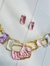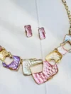 pastel geometric necklace set, enamel statement jewelry, gold chain necklace with earrings, modern fashion jewelry for women, colorful statement necklace