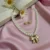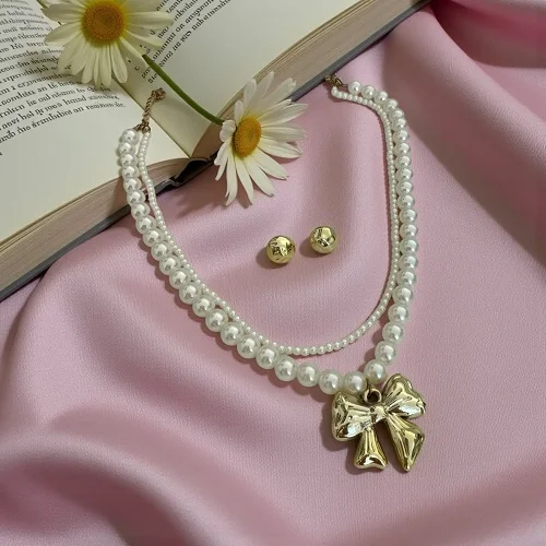 Gold Bow Pendant Pearl Layered Necklace Set for Women & Girls – Elegant Korean Fashion Jewellery with Stud Earrings