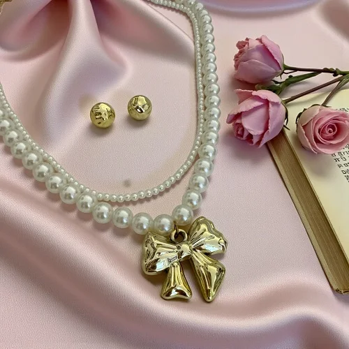 • Dual-layer pearl necklace with a stylish gold bow pendant