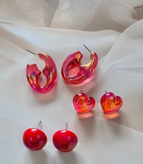 Turn heads with this Iridescent Red Resin Earrings Set, featuring three stunning styles — chunky abstract hoops, glossy heart studs, and bold round domes. Each pair gleams with a rich, fiery red hue and a holographic shine that reflects golden and pink tones in the light, adding instant glamour to any outfit.