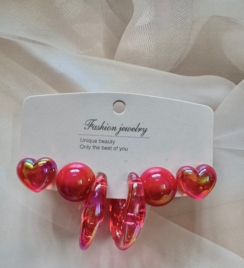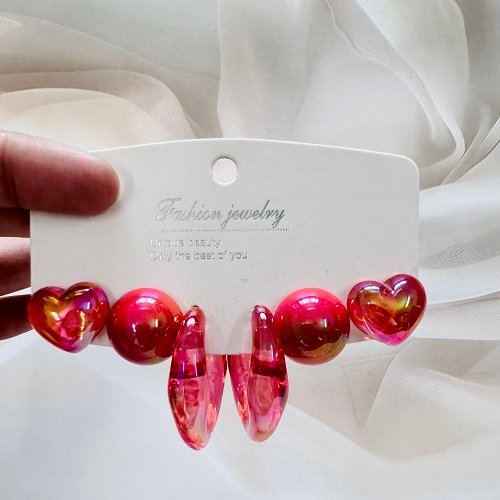 Turn heads with this Iridescent Red Resin Earrings Set, featuring three stunning styles — chunky abstract hoops, glossy heart studs, and bold round domes. Each pair gleams with a rich, fiery red hue and a holographic shine that reflects golden and pink tones in the light, adding instant glamour to any outfit.